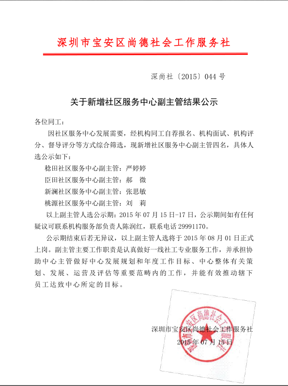 关于新增社区服务中心副主管结果公示