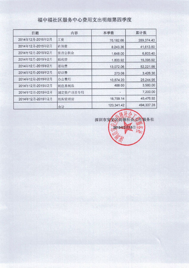 福中福社区服务中心费用支出明细第四季度的公示