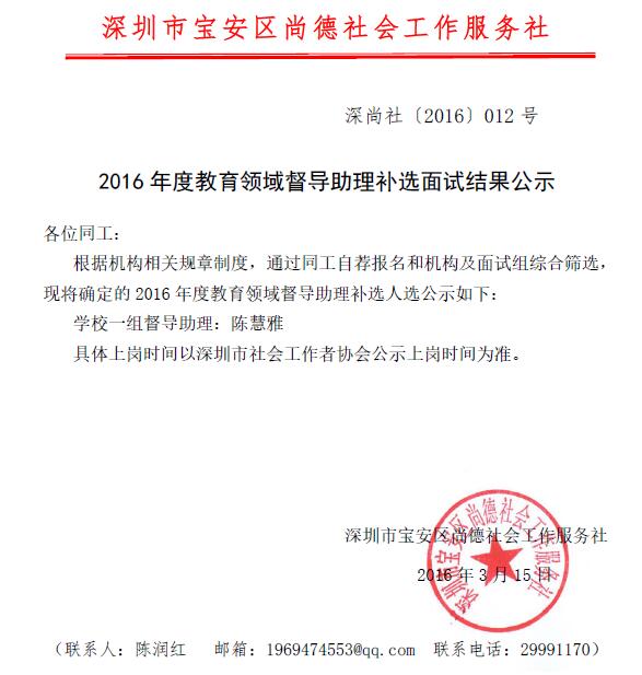 2016年度教育领域督导助理补选面试结果公示