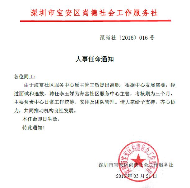 关于聘任李玉娣为海富社区服务中心主管的人事任命通知的公示