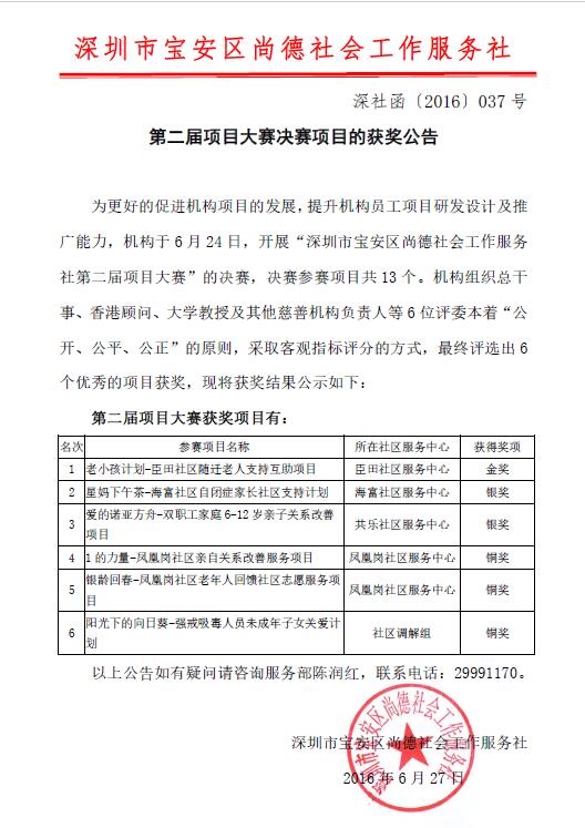 第二届项目大赛决赛获奖公告深尚函【2016】037号