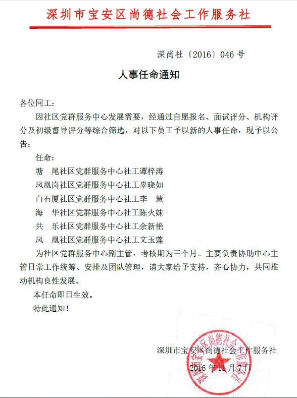 2016.11.7关于机构副主管的人事任命通知 深尚社【2016】046号