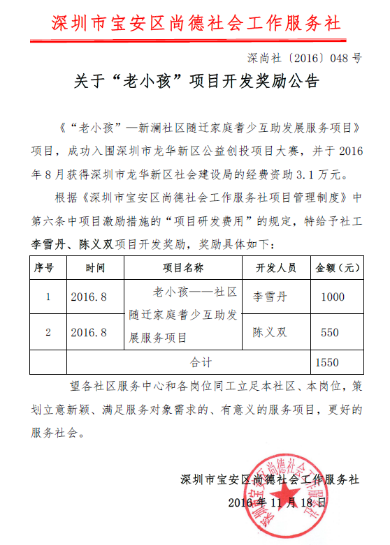 关于老小孩项目开发奖励公告深尚函【2016】048