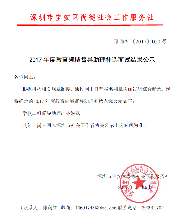 2017年度教育领域督导助理补选面试结果公示 深尚社【2017】010号