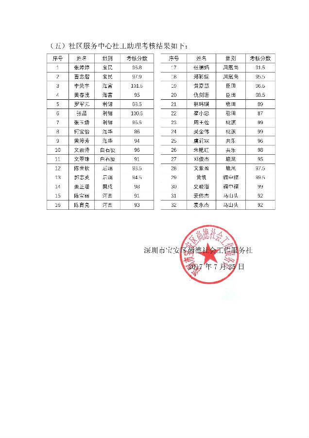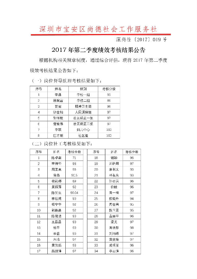 2017年第二季度绩效考核结果公告深尚社【2017】019号