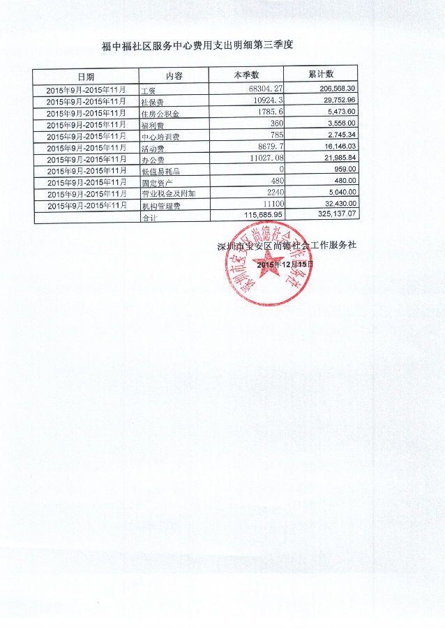 福中福社区服务中心2015年9月-2015年11月费用支出明细的公示