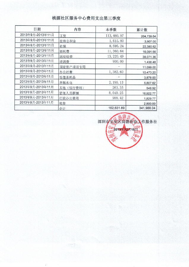 桃源社区服务中心2013年9月-2013年11月费用支出明细的公示