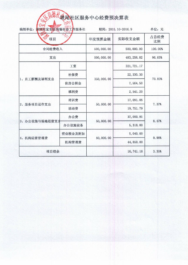 塘尾社区服务中心2015年10月-2016年9月经费预决算表的公示