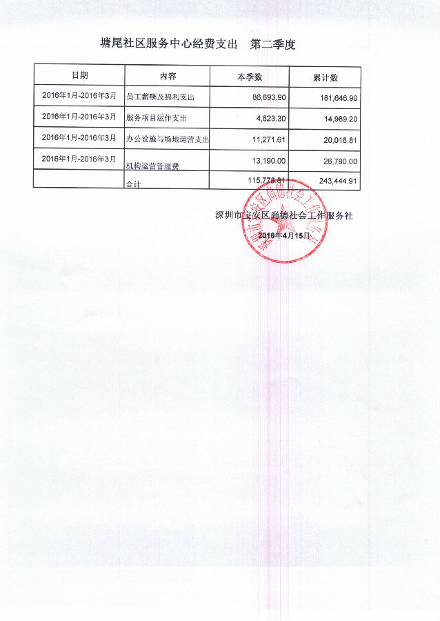 塘尾社区服务中心2016年1月-2016年3月经费支出的公示