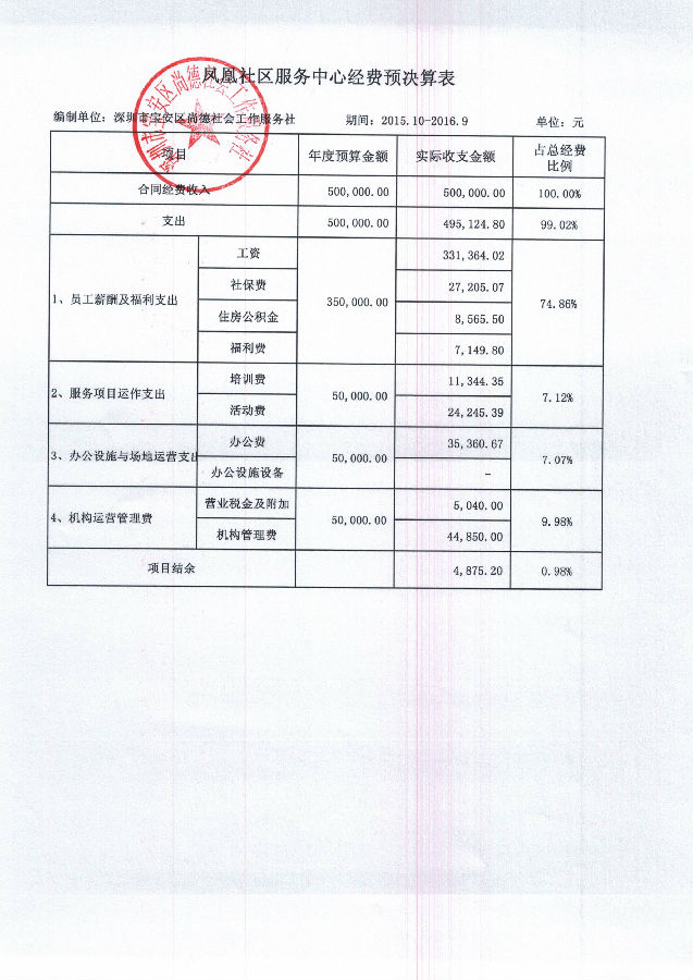 凤凰社区服务中心2015年10月-2016年9月经费预决算表的公示
