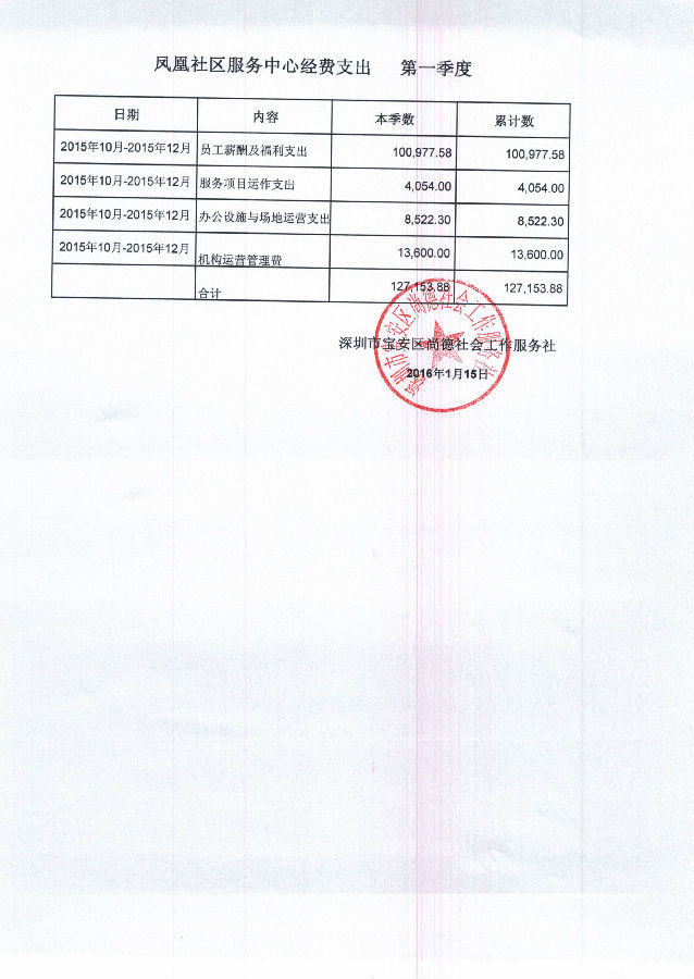 凤凰社区服务中心2015年10月-2015年12月经费支出的公示