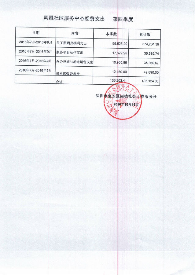 凤凰社区服务中心2016年7月-2016年9月经费支出的公示