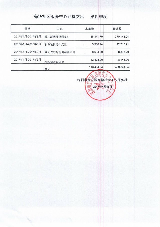 海华社区服务中心2017年1月-2017年3月经费支出的公示