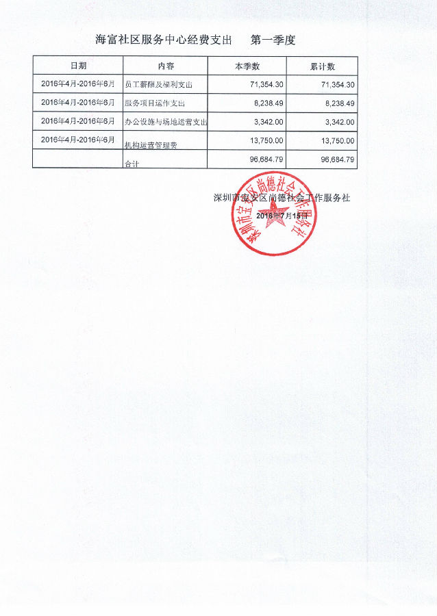 海富社区服务中心2016年4月-2016年6月经费支出的公示