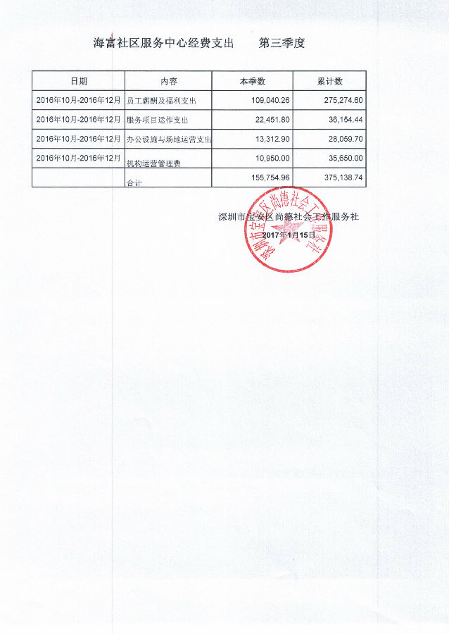 海富社区服务中心2016年10月-2016年12月经费支出的公示