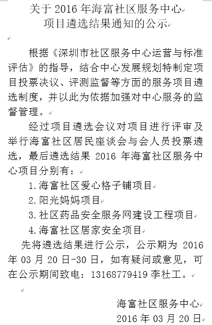 关于2016年海富社区服务中心项目遴选结果通知的公示
