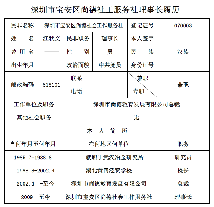关于深圳市宝安区尚德社工服务社理事长履历的公示