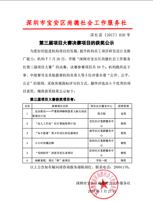 关于第三届项目大赛决赛项目的获奖公示 深尚函【2017】020号