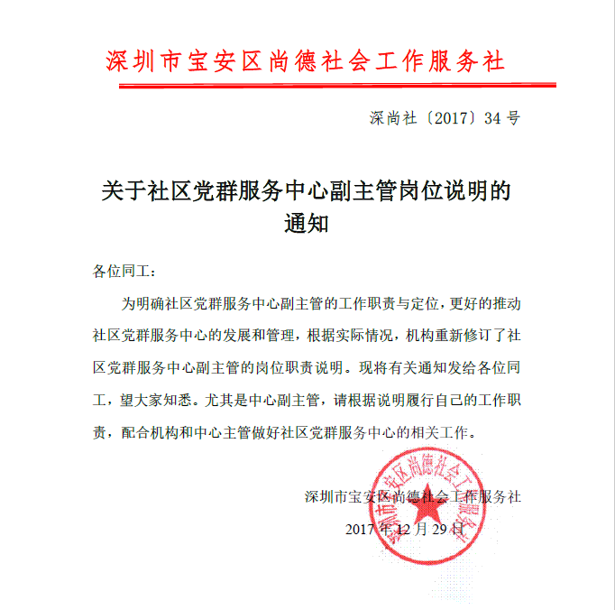 关于社区党群服务中心副主管岗位说明的通知深尚社〔2017)034号