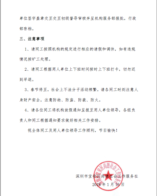 2018年1月16日关于春节放假安排的通知 深尚社〔2018〕001号