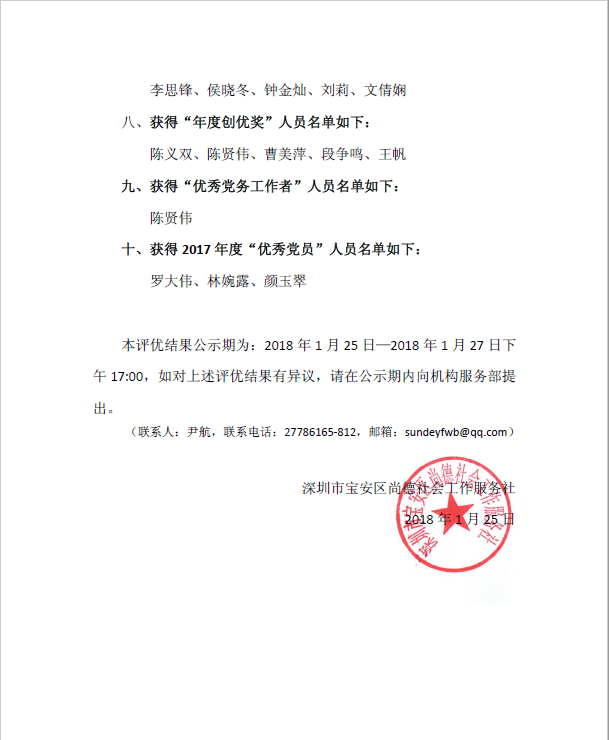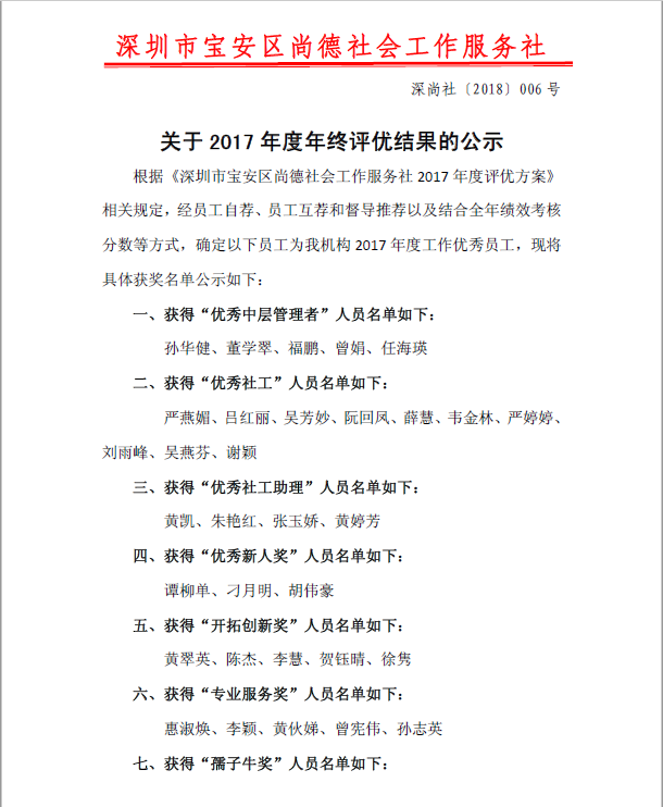 关于2017年度年终评优结果的公示 深尚社〔2018〕006号