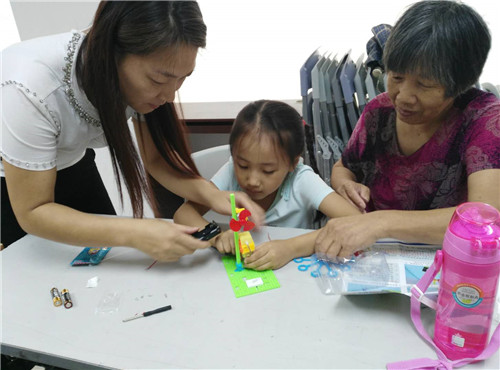 本次小组主要围绕废物利用、科普小实验来增进组员对环保概念的新认识。家长和孩子们用自己灵巧的手,用矿泉水瓶、旧电池、包装袋,冰糕棍等,通过拼、剪、折等形式,制作出了一件件精美、有创意的作品,比如DIY吸尘器、泡泡机、电风扇、小台灯等,在利用废品的同时教育了孩子要增强日常的环保意识及发挥想象力。家长和孩子们纷纷参与其中并称赞不已,其中妞妞的家长高兴地说:“社区举办这个活动,家长们很高兴,可以把我们聚在一起沟通交流,我们就像一个和谐的大家庭,更增进邻里间的交流了。”