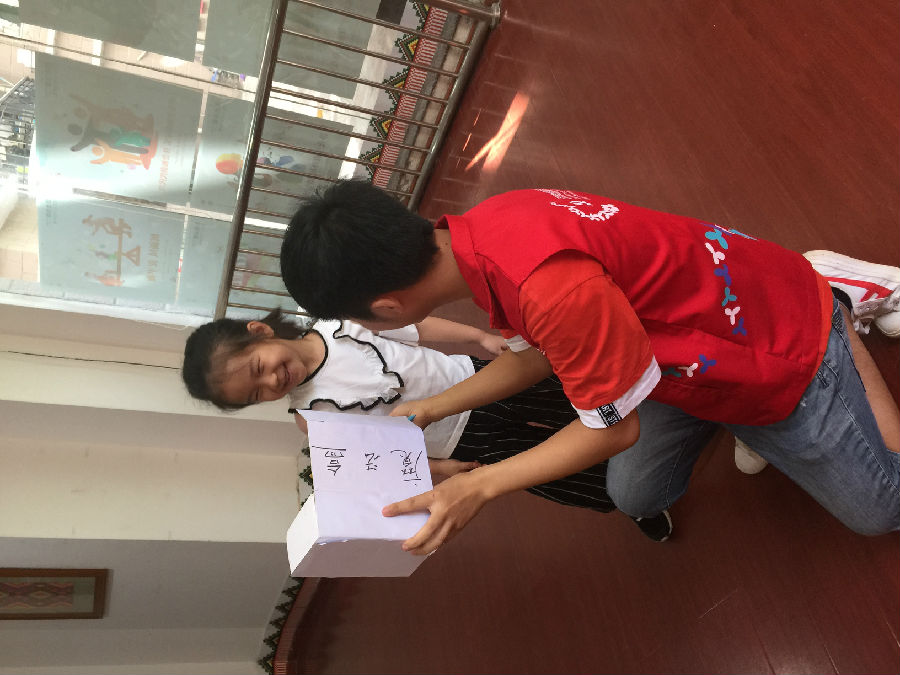 2018年8月3日上午九点半,在桃源居14区C栋1楼民族园内,社工正带领青少年朋友开展着抗逆力小组的最后一节。9位青少年朋友正坐在椅子上,排着队,一个一个的上前观看社工手中的魔法盒,小脸上充满了期待。