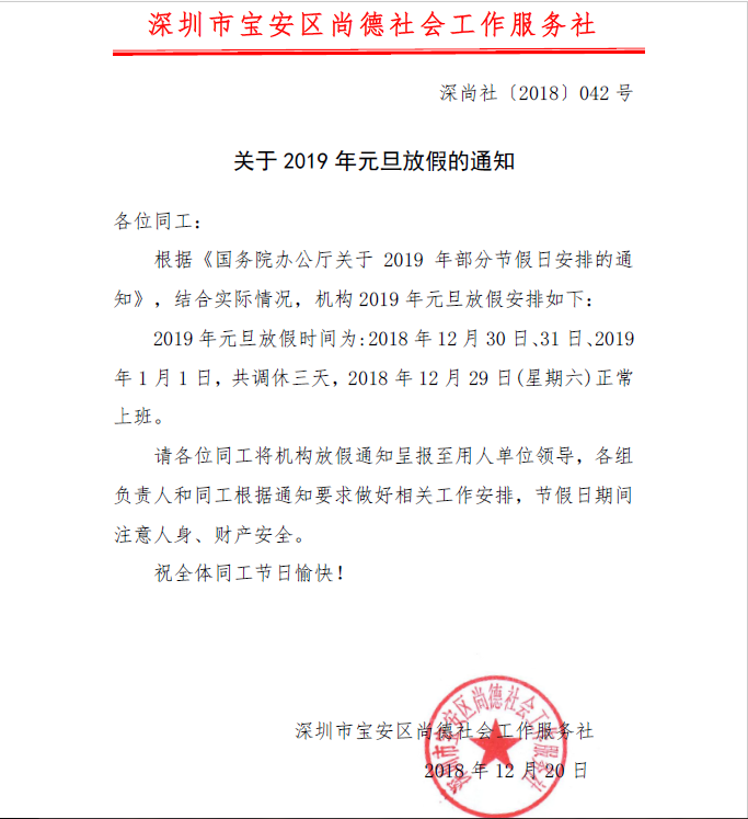 深尚社〔2018〕042号 关于2019年元旦放假的通知