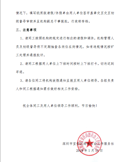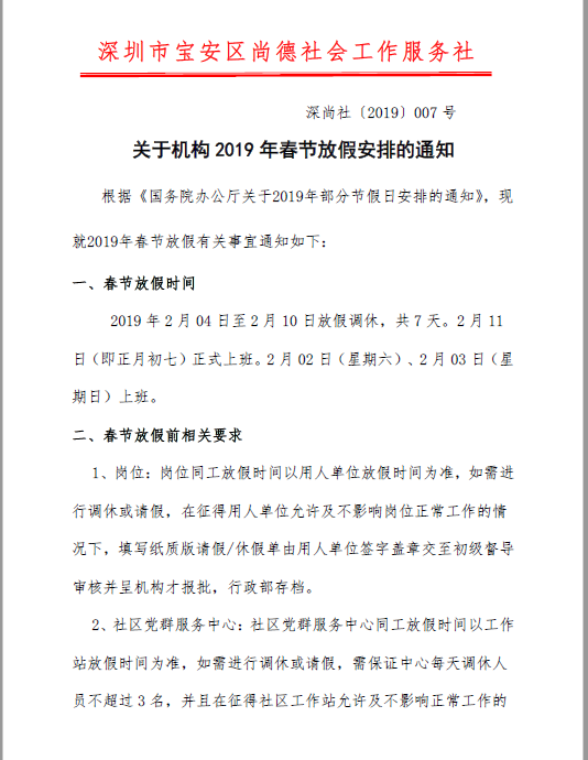 关于机构2019年春节放假安排的通知深尚社〔2019〕007号