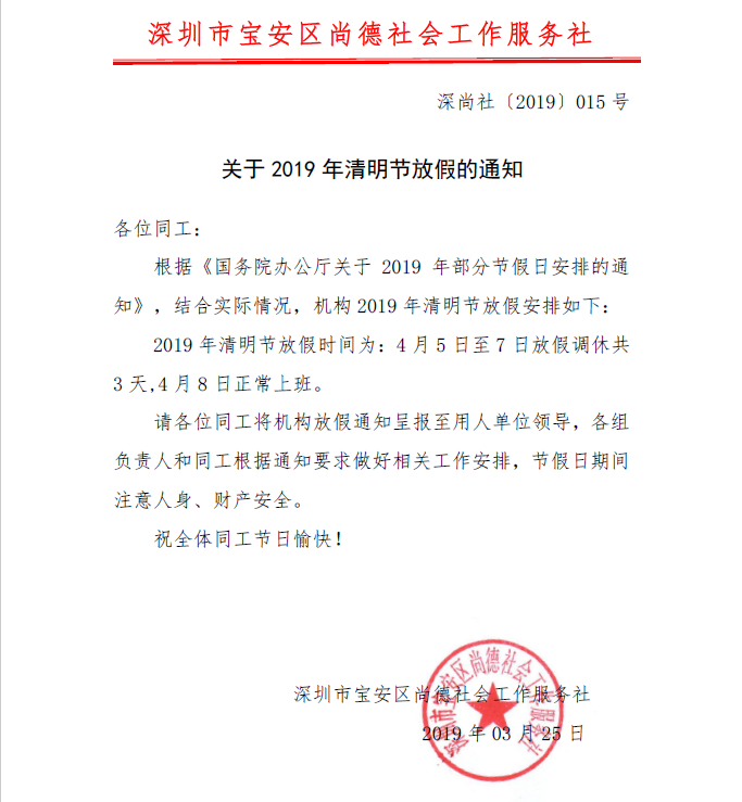 深尚社〔2019〕015号 关于2019年清明节放假的通知