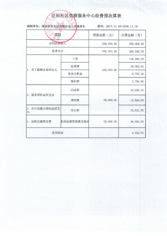 臣田社区党群服务中心经费预决算表