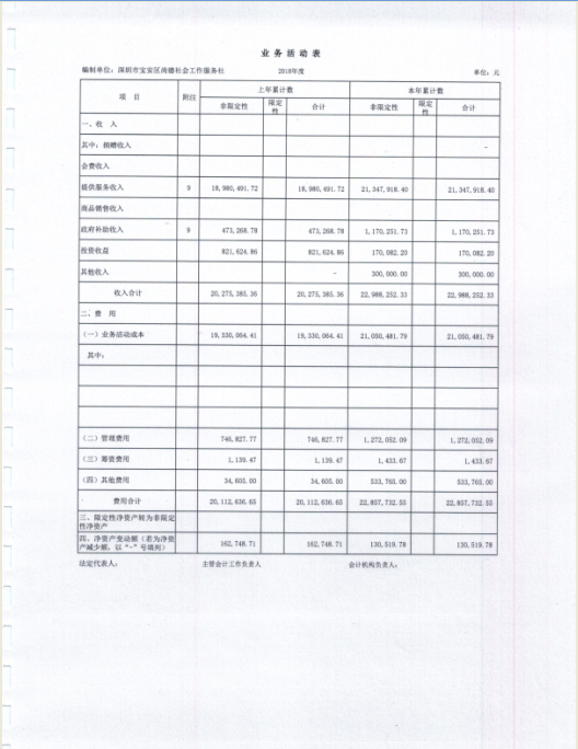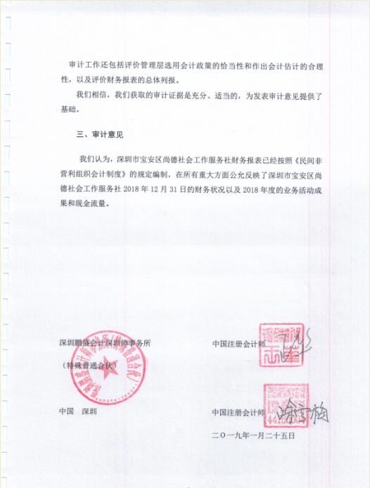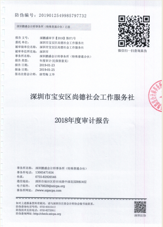 关于深圳市宝安区尚德社会工作服务社2018年度财务审计报告的公示