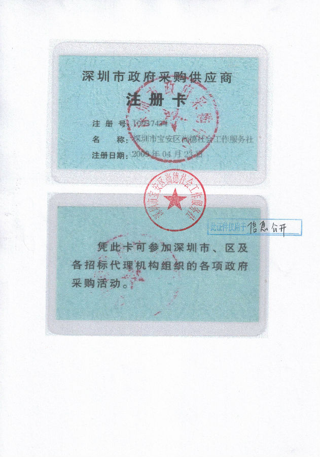 关于深圳市宝安区尚德社会工作服务社公开深圳市政府采购供应商注册卡的公示