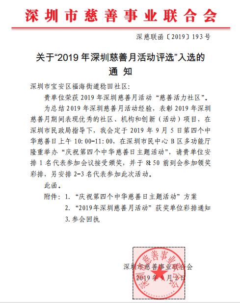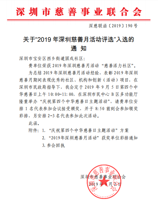 固戍社区、稔田社区荣获2019年深圳慈善月活动“慈善活力社区”