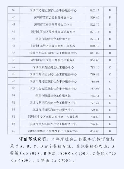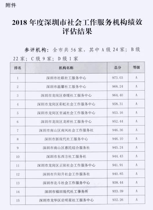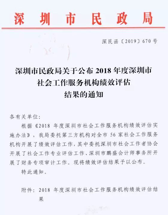 深圳市民政局关于公布2018年度深圳市社会工作服务机构绩效评估结果的通知