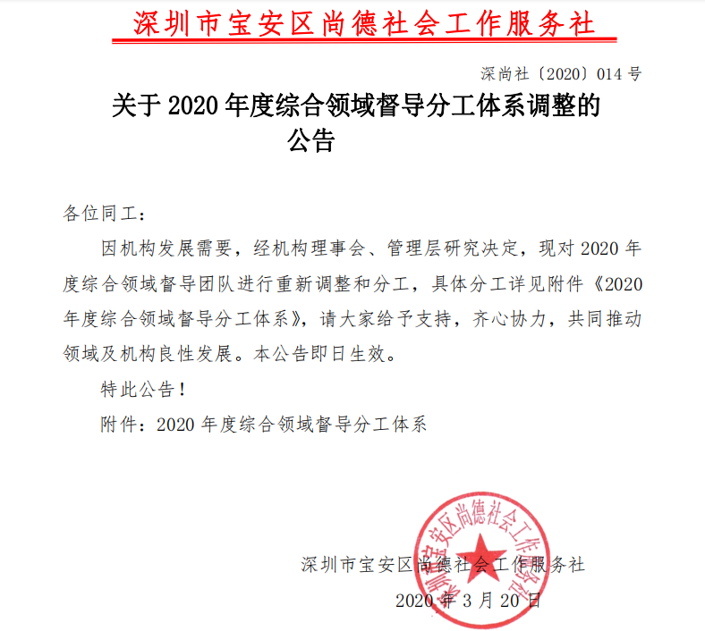 深尚社〔2020〕014号关于2020年度综合领域督导分工体系调整的公告