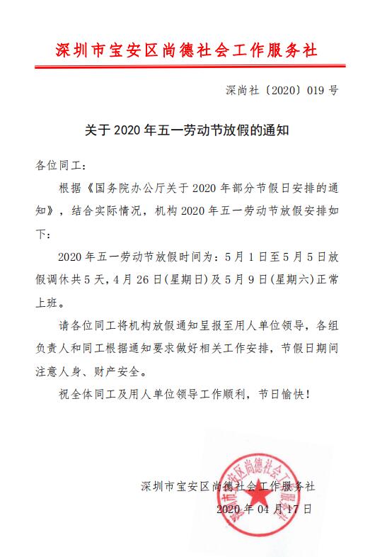 深尚社〔2020〕019号 关于2020年五一劳动节放假的通知