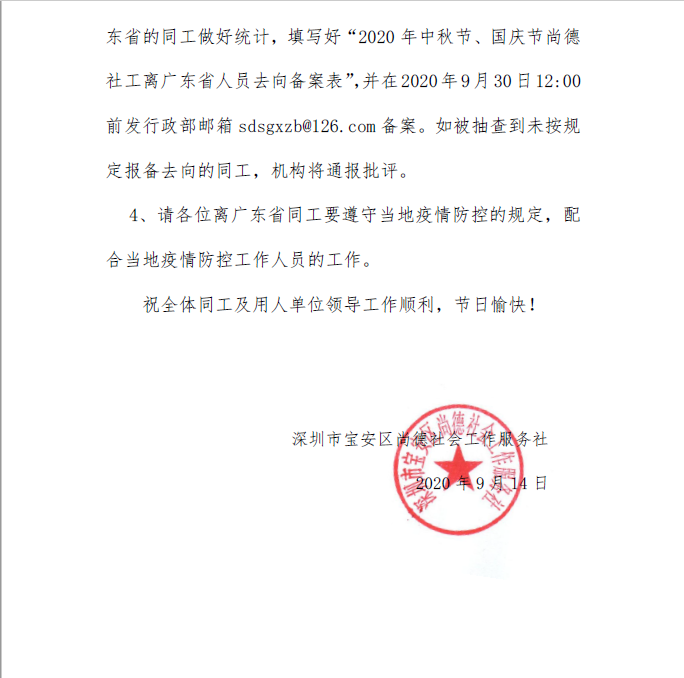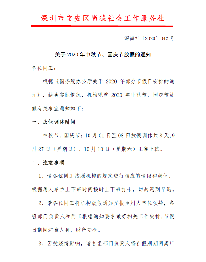 深尚社〔2020〕042号关于2020年中秋节、国庆节放假的通知