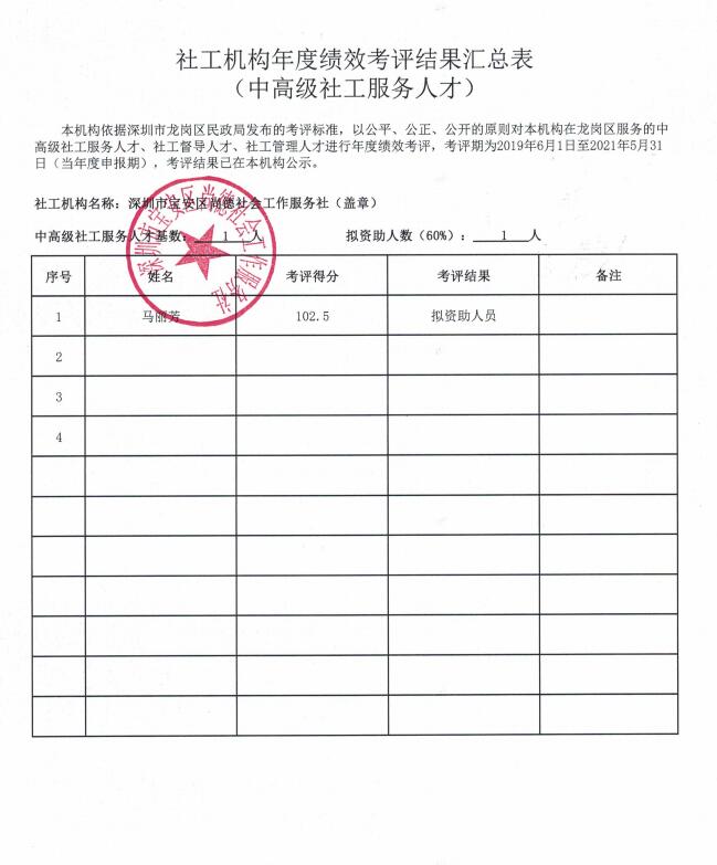 关于龙岗区社工机构年度绩效考评结果汇总表(中高级社工服务人才)公示
