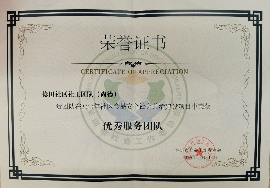 稔田社区荣获2019年社区食品安全社会共治建设项目中荣获优秀服务团队