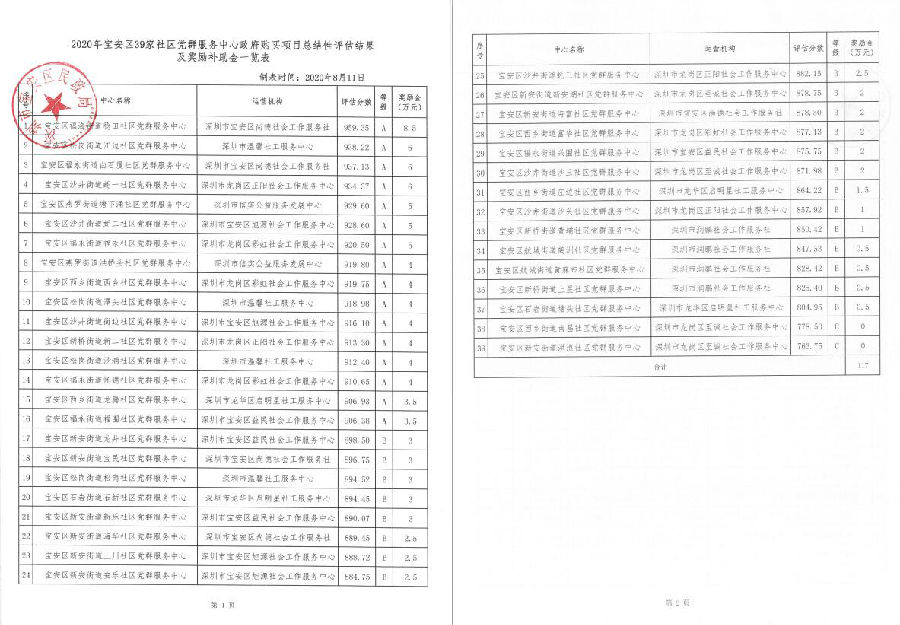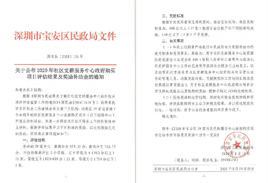 关于公布2020年社区党群服务中心政府购买项目评估结果及奖励补助金的通知