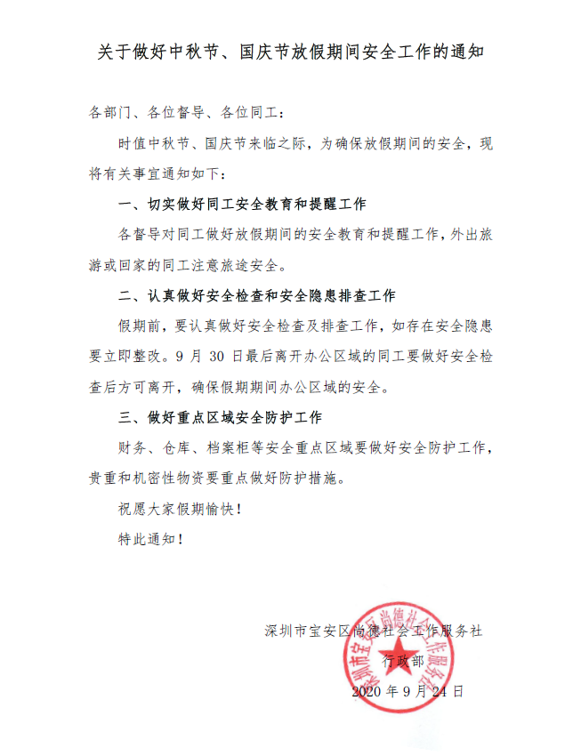 关于做好2020年中秋节、国庆节放假期间安全工作的通知
