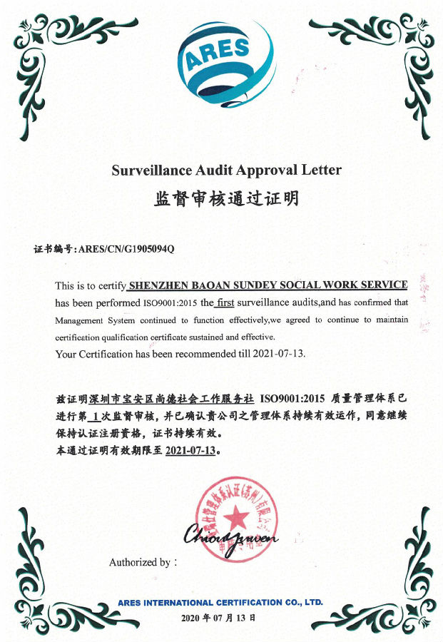 深圳市宝安区尚德社会工作服务ISO9001:质量认证证书。