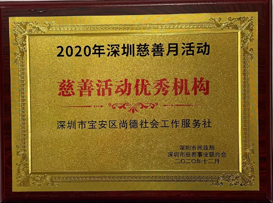 深圳市宝安区尚德社会工作服务社在2020年深圳慈善月活动中被评为慈善活动优秀机构。