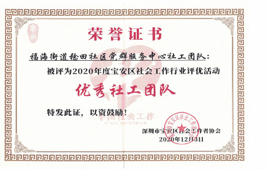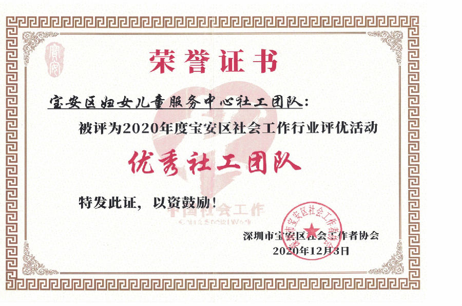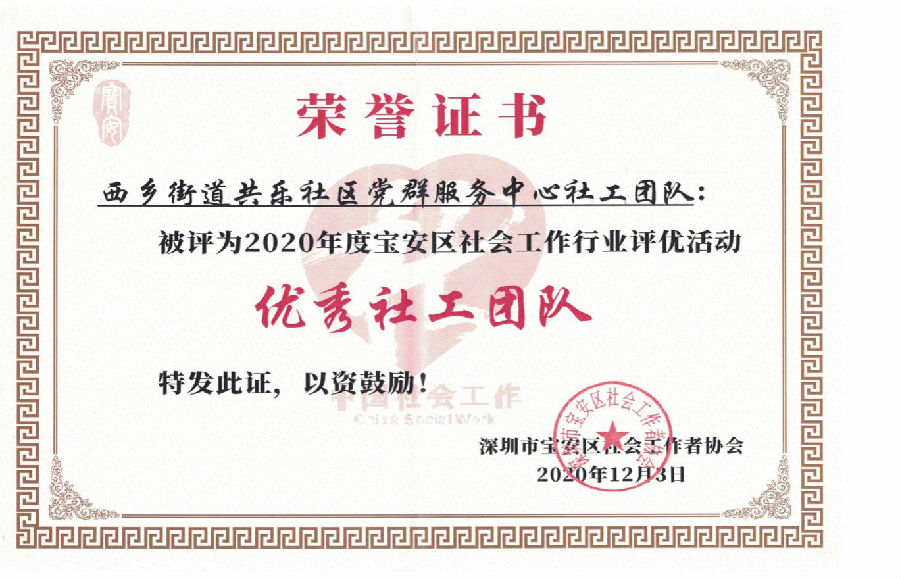 共乐社区、稔田社区、宝安区妇女儿童服务中心被评为2020年度宝安区社会工作行业评优活动优秀社工团队。