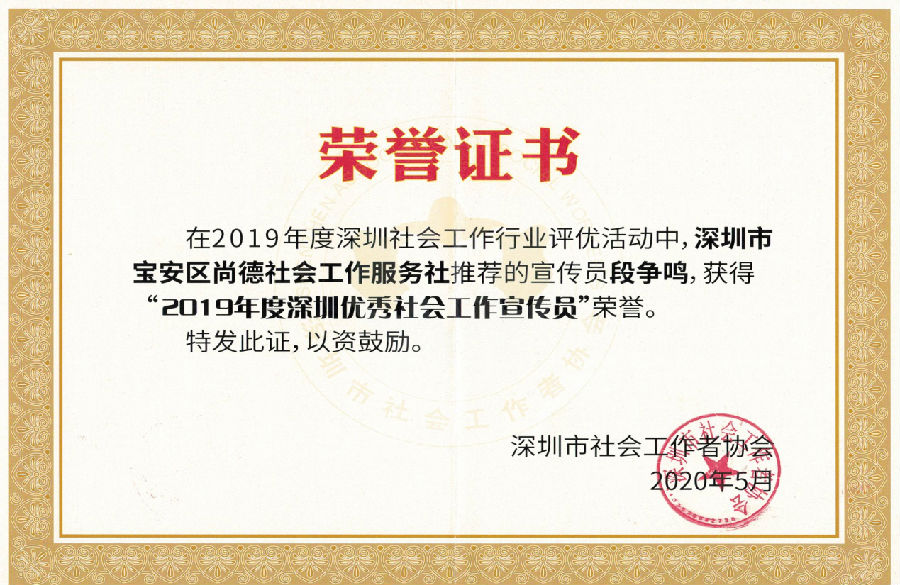 段争鸣获2019年度深圳优秀社会宣传员。