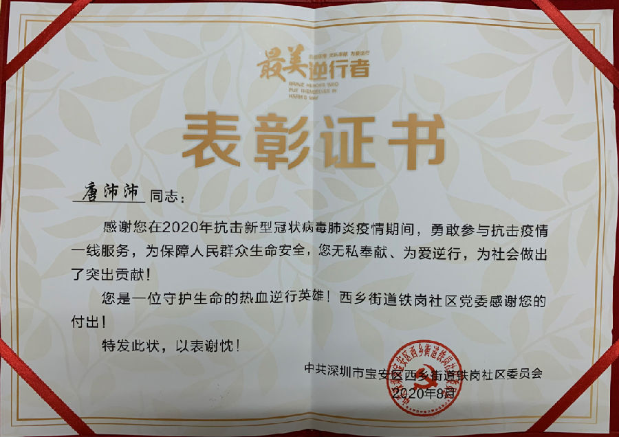 唐沛沛-获得2020年抗疫最美逆行者表彰-证书。