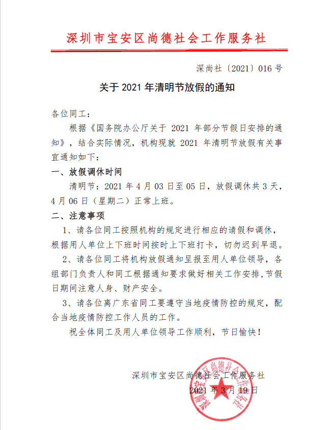 深尚社〔2021〕016号 关于2021年清明节放假的通知