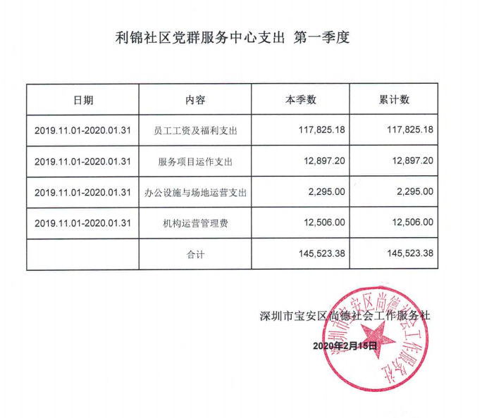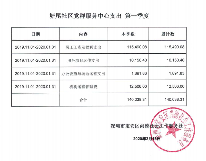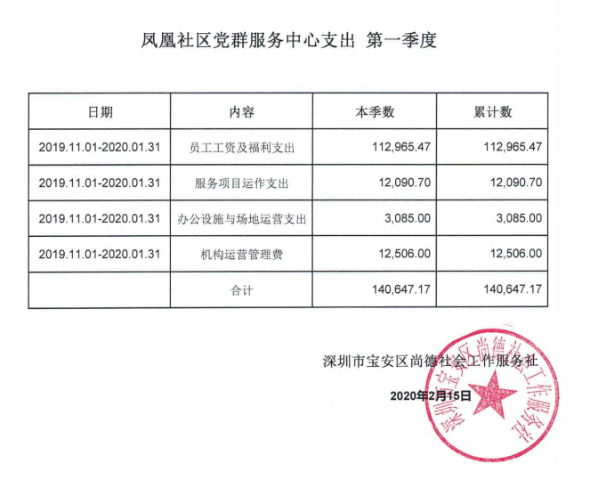 宝安区塘尾社区、凤凰社区、利锦社区、河西社区党群服务中心支出第一季度公示