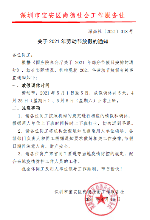 深尚社〔2021〕018号 关于2021年劳动节放假的通知